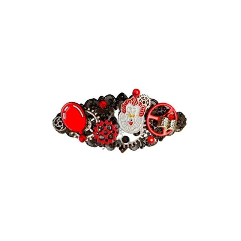 Red ballons, Evil Clowns, Books by Stephen King... this steampunk hair clip is a one of a kind barrette. The 3 inch long french clip base is painted black, with layers of gears, swarovski crystals and charms. One of a kind.