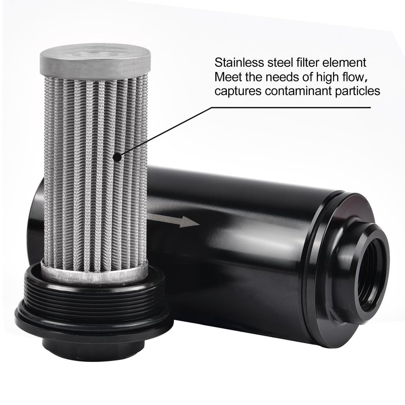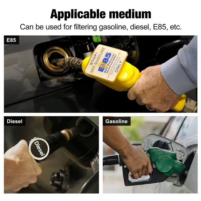 - [Function] Can be used for filtering gasoline, diesel, E85, etc. Captures contaminant particles of 40 micron and above to protect the fuel system of the vehicle.