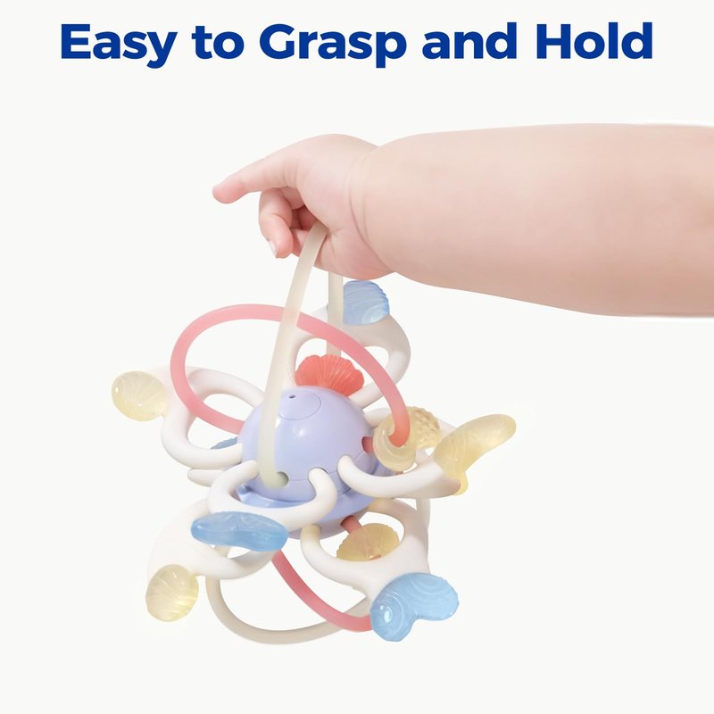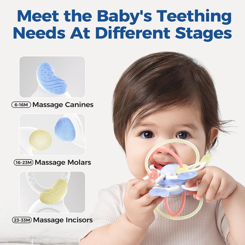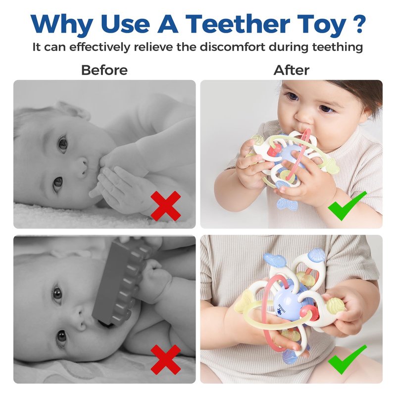 - [6-in-1 Interactive Newborn Toys]: Twist, pull, interact, stare, shake, and bite! The central ball of our baby teether can be rotated to develop fine motor skills; flexible tubes are soft but sturdy enough to withstand even the toughest pulling by babies; bright colors and the clicking sound of the central ball attracts babies' attention easily; the silicone chewing points come in 2 different hardness levels, with various nubs and textures that are perfect for chewing and soothing gums