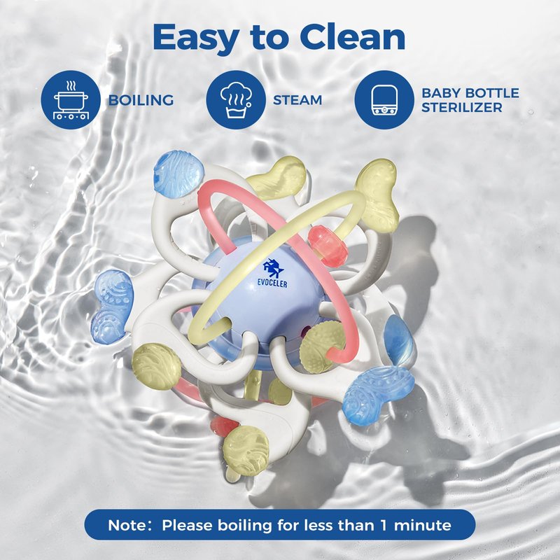 - [Easy to Clean & Store]: The one-piece design of our baby teethers prevents dirt accumulation, and the included protective case ensures convenient storage. Our baby toy is dishwasher safe and easy to clean via wiping, boiling, steaming, or microwaving, always clean as new!