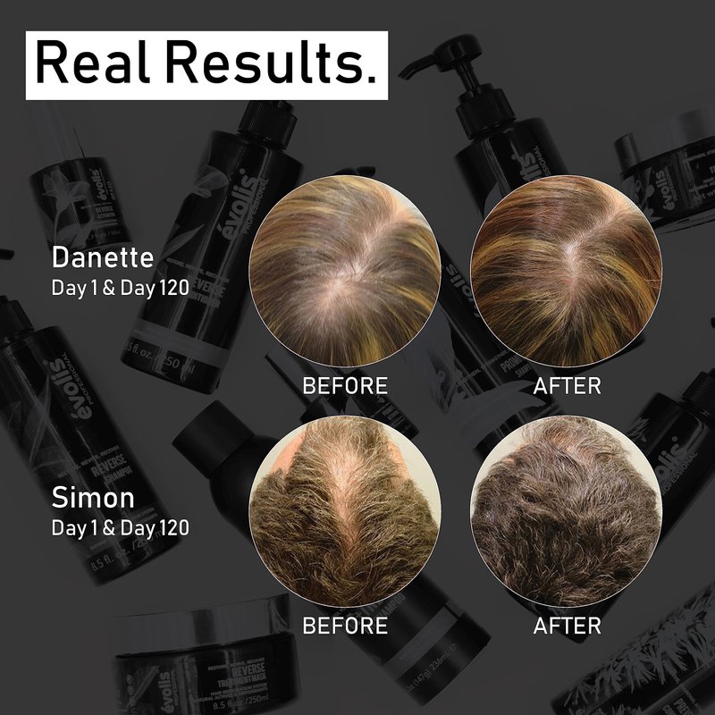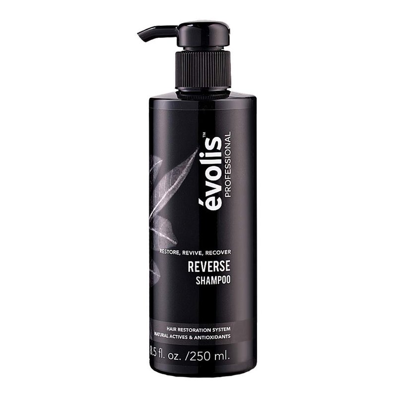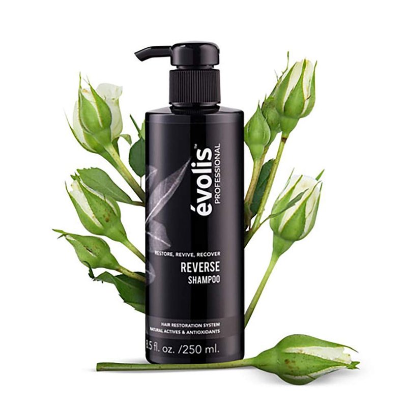 Bring Back Your Best Hair | évolis REVERSE Shampoo is a professional shampoo for hair loss that targets thinning and aging hair. Its proprietary blend of natural actives and antioxidants promotes hair and scalp health to help fortify every strand, promote new growth and block the FGF5 protein which causes hair aging and thinning. Key active botanicals include powerful FGF5 blockers such as sanguisorba officinialis (Red Burnet), rosa multiflora (Japanese Rose) and swertia chirata, traditionally used in Chinese and Ayurvedic medicine for its antioxidant and humectant properties to lock moisture into hair fibers. It also contains mangosteen and linseed to soothe and nourish the scalp to promote hair growth from roots to ends. Its color-safe and keratin-safe formula includes added volume boosters to instantly lift roots and create the appearance of fuller, thicker hair, while simultaneously protecting and cleansing the scalp. In a consumer usage study of 79 users, 95% of participants noticed an increase in hair thickness within 90 days of use when used in conjunction with REVERSE Activator.