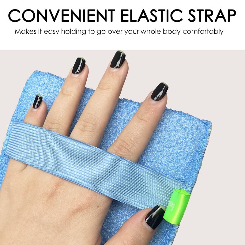 - Reusable exfoliating 3D body sponge with handy elastic strap that goes over your hand easily so that you don't drop it in the shower