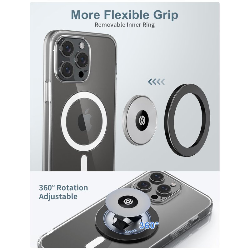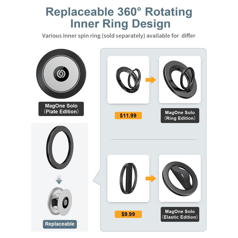 - 【Double 360° Rotation】 MagOne Solo (Plate Edition)phone grip has a rotatable outer and inter ring for smooth 360° rotating. Multi-angle adjustment provide your with best viewing angle and flexible & comfortable hand grab experience without uncomfortable pain.