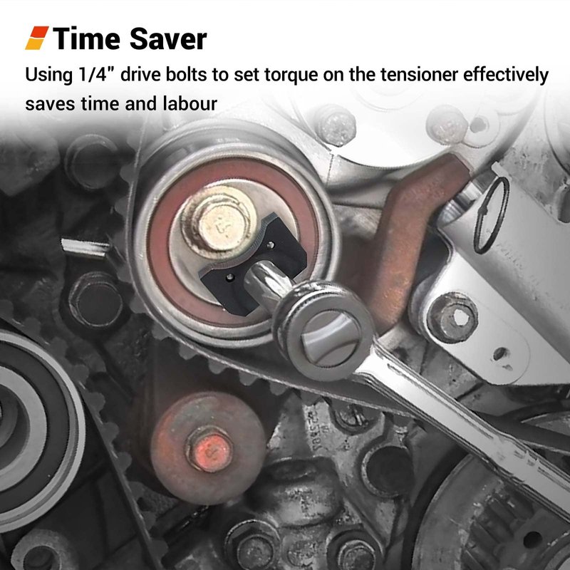 - 【Easy Operation】 Hold the tensioner pulley in place while adjusting the tension of the timing belt to specification. Two cylinders designed to fix the tension pulley. Set correct torque on tensioner with the 1/4" drive bolt simply by yourself.