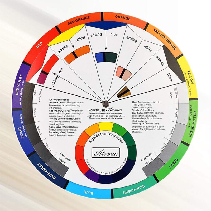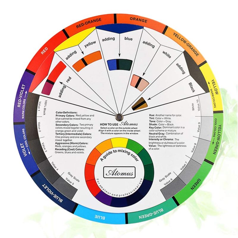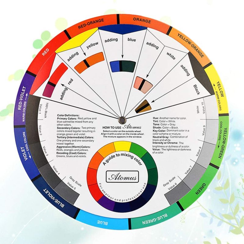 The color wheel explains color-related terms and demonstrates how the colors are created and affected by each other.