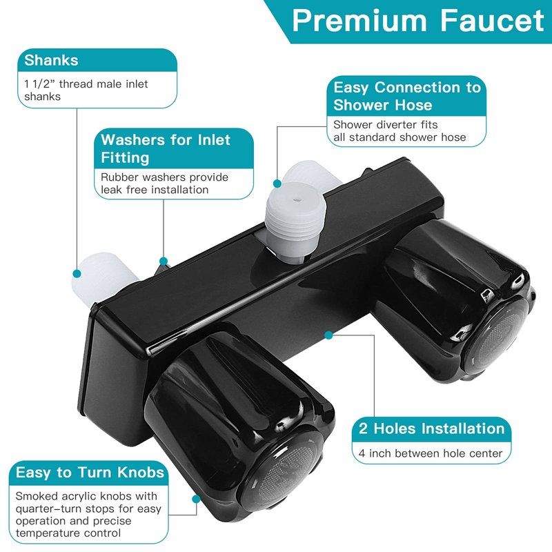 - Premium Construction: Constructed of sturdy smoked crystal acrylic knob, fully functional diverter and premium lightweight synthetic waterways. The classic style rv camper shower faucet is easy to match most rv bathroom and easy to clean.