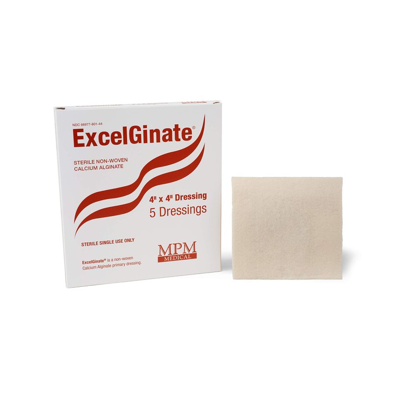 MPM Medical's ExcelGinate is a sterile calcium alginate for wound care. Sterile, in a BOX of 5. .254" x 4.25". From MPM Medical. High Quality Wound Dressing. Expiration Date: 3 years from DOM. ExcelGinate is 200g thick allowing it to absorb more exudate, and form a thicker protective barrier than our competition. This dressing is made from seaweed spun into flat dressing. When coming into contact with wound exudate it transforms into moist gel consistency. It absorbs up to 20 times of its weight. Conforms to the shape of the wound and fills in dead space. It promotes healing and facilitates autolytic debridement. Indications: Full- or partial-thickness wound with moderate to heavy exudate, including infected wounds or wounds with tunneling and/or undermining Bleeding wound (helps achieve hemostasis). Contraindications: Third-degree burns, minimal exudate or dry wound. Frequency: change every 1 to 3 days depending on amount of exudate (per wound care provider). Change when exudate “strike-through” in the top layer or surrounding tissues. If dressing needs to be changed more than twice daily, reassess appropriateness. Cover it with secondary dressing. Don’t moisten this product before using. Do not use this product in combination with a hydrogel. Dressing can dehydrate wound bed. If the wound bed dries, the dressing will not form a gel and may adhere to granulation tissue, causing trauma to healing tissue. If alginate dressing appears dry or sticks to the wound, saturate it with sterile saline or wound cleanser to facilitate dressing removal. If dressing is repeatedly dry upon removal, reassess if continued use of alginate dressing is appropriate. Don’t use too much of the product because overpacking may delay wound healing.