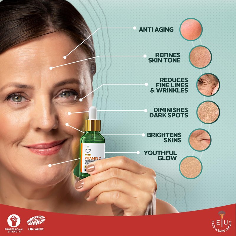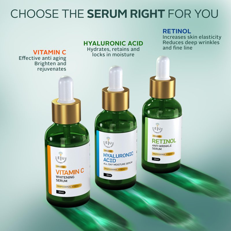 Discover the secret to timeless beauty with Excellence Unique's premium range of organic, professional-strength anti-aging serums. Specifically formulated to replenish and rejuvenate your skin, our serums are a testament to our commitment to quality and effective skincare. Infused with potent ingredients like Vitamin C, Hyaluronic Acid, and antioxidant-rich botanicals, these face serums are designed to restore your skin's youthful radiance and provide deep hydration.
