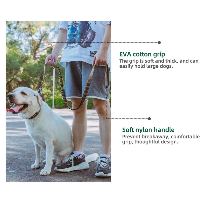 - Elastic bands provide ductility. The elastic dog leash have elastic stretch(expands about 12 inches), elasticity cushion keeps your arm or your dog's body from getting yanked when your dog's change direction or forward suddenly,the enough stretch will reduce risk of injury and increases comfort.