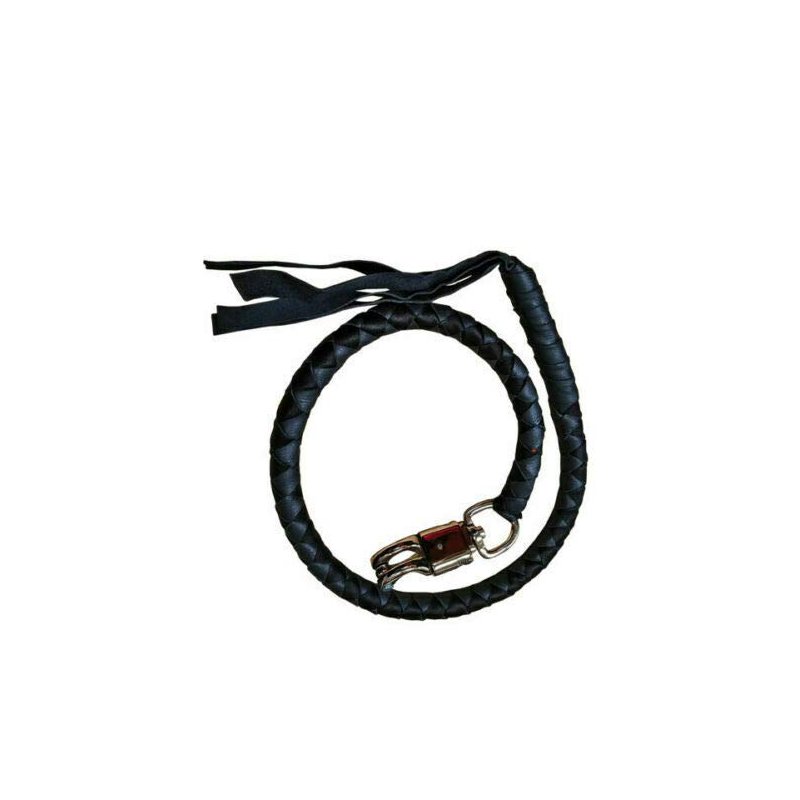 Universal Fitting Leather Motorcycle Get Back Whip 42 Inch Long, Quick Release Black Universal Fitting Leather Motorcycle Get Back Whip Features: Genuine, Leather hand-braided get back whip Nylon core Solid, heavy-duty, stainless steel quick-release Tight, black leather wrapping near end Black threaded fringe at the end 1 small silver skull tied to fringe Clasp diameter 3/4" x 3/4" 42" length.