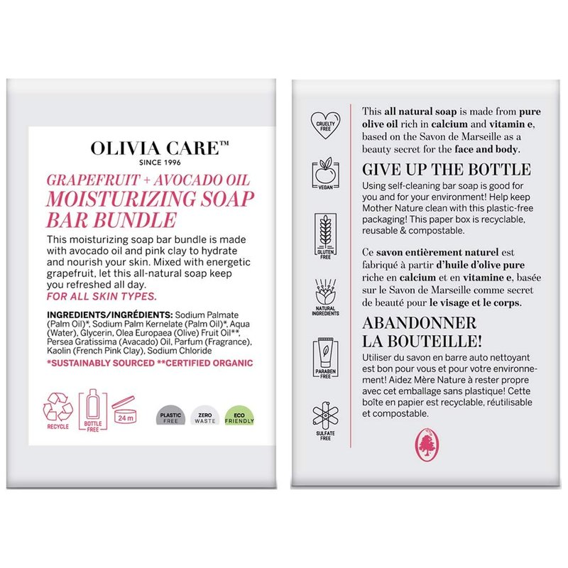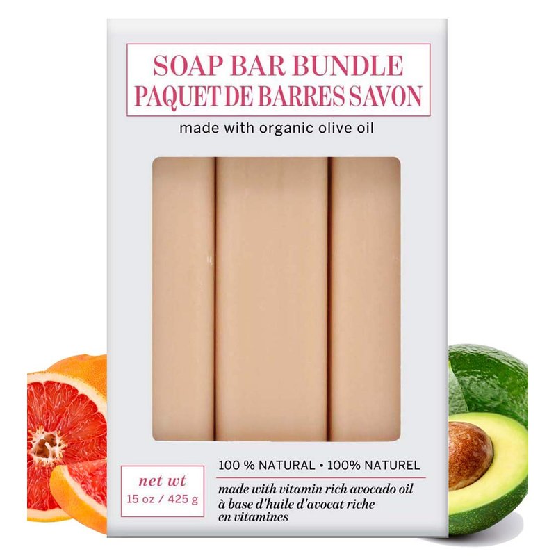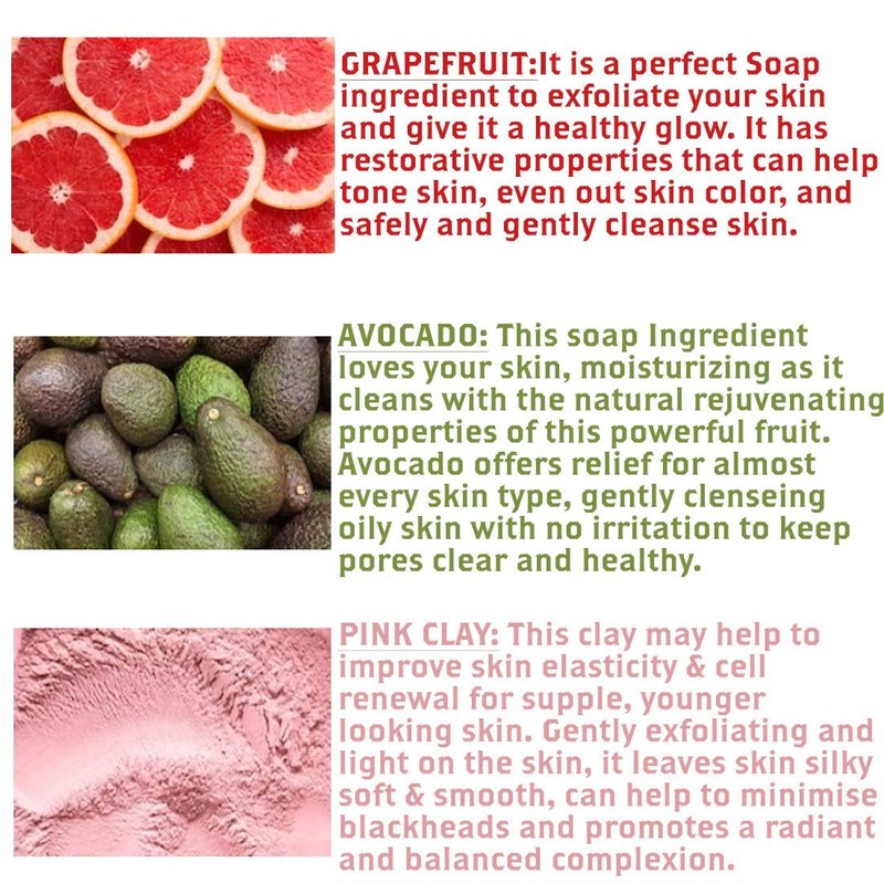 - INFUSED WITH GRAPEFRUIT + AVOCADO OIL: This moisturizing soap bar bundle is made with avocado oil and pink clay to hydrate and nourish your skin. Mixed with energetic grapefruit, let this all-natural soap keep you refreshed all day.