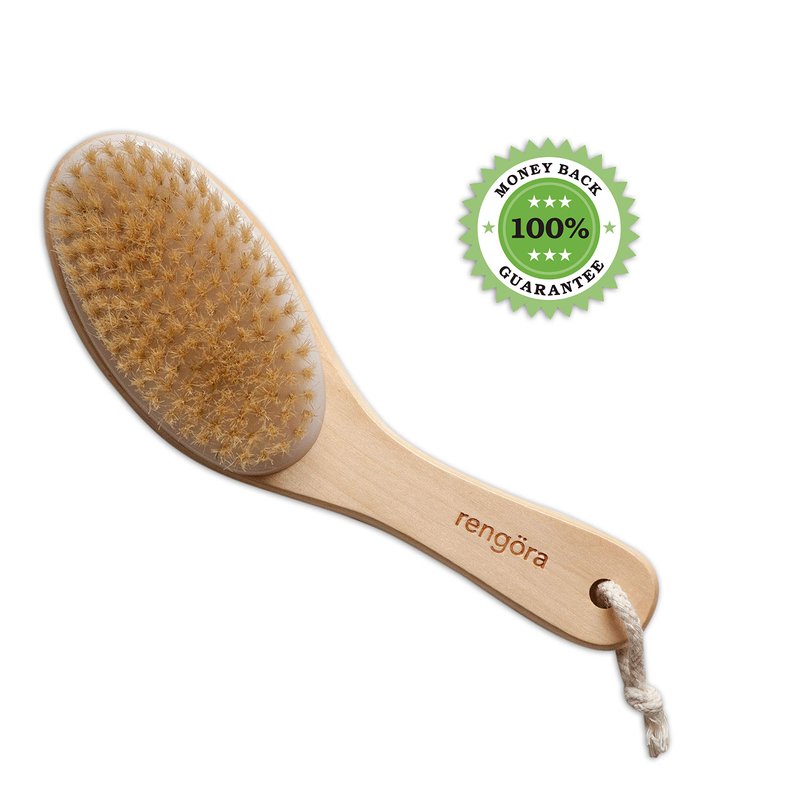 Exfoliating Body Scrubber: Dual-Use for Wet/Dry Exfoliation, Lymphatic Drainage & Cellulite Smoothing - Natural Boar Bristle Dry Brushing Body Brush, Ergonomic Handle, Easy to Clean by Rengöra