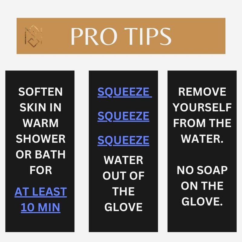 - HOW TO USE: Step 1: Soak in warm water for at least 10 minutes. Step 2: Rinse off soap completely off your skin. Step 3: Wet our exfoliating glove and squeeze all water out. 4) Proceed with exfoliating your skin in an up and down motion until dead skin comes off. NOTE: Skin should be soap-free when using the glove.