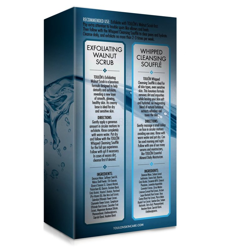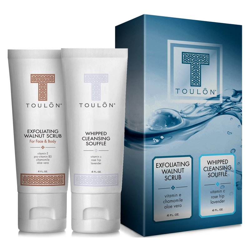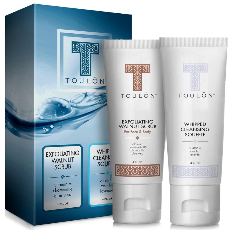 Open the gorgeous gift box to find 2 popular bath & shower products: TOULON Walnut Body and Face Exfoliant Scrub and TOULON Whipped Souffle Face Cleanser for Acne Clearing Anti Aging Repair.