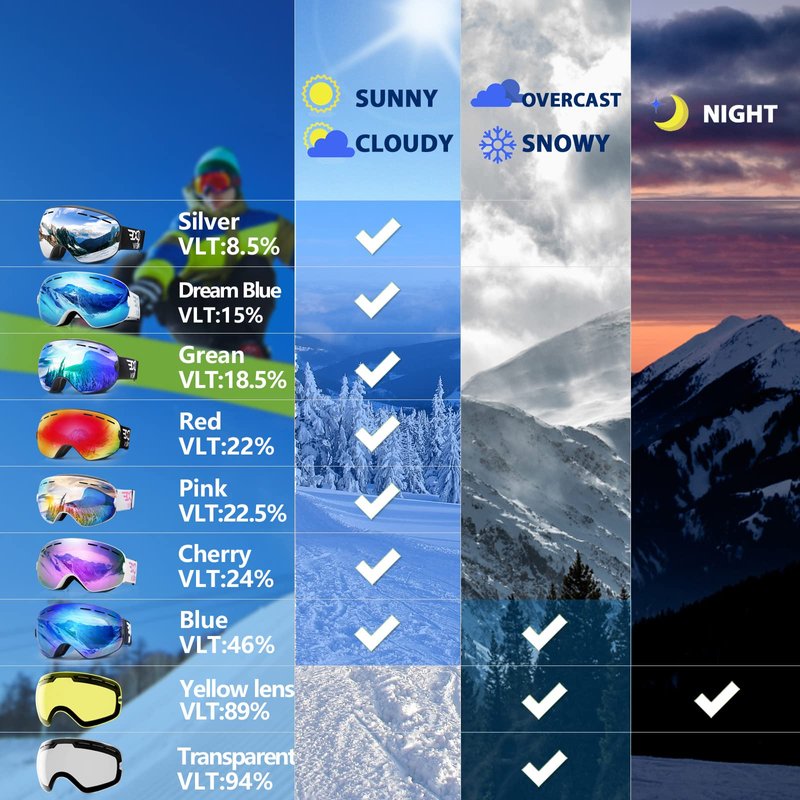 For selecting a right ski goggle, we offering below information(different lens VLTs):