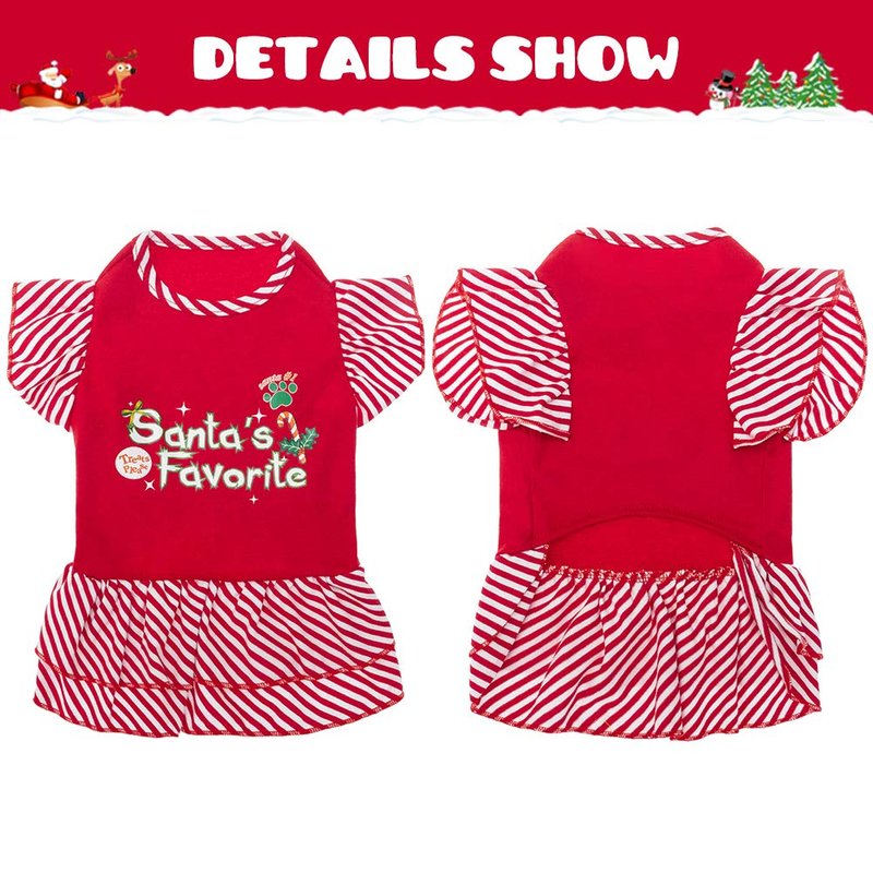 - CUTE APPEARANCE: Overall Christmas red color, featuring red striped ruffled hem and short sleeve design, and printed with the words "Santa's Favorite", making your pet look more attractive.