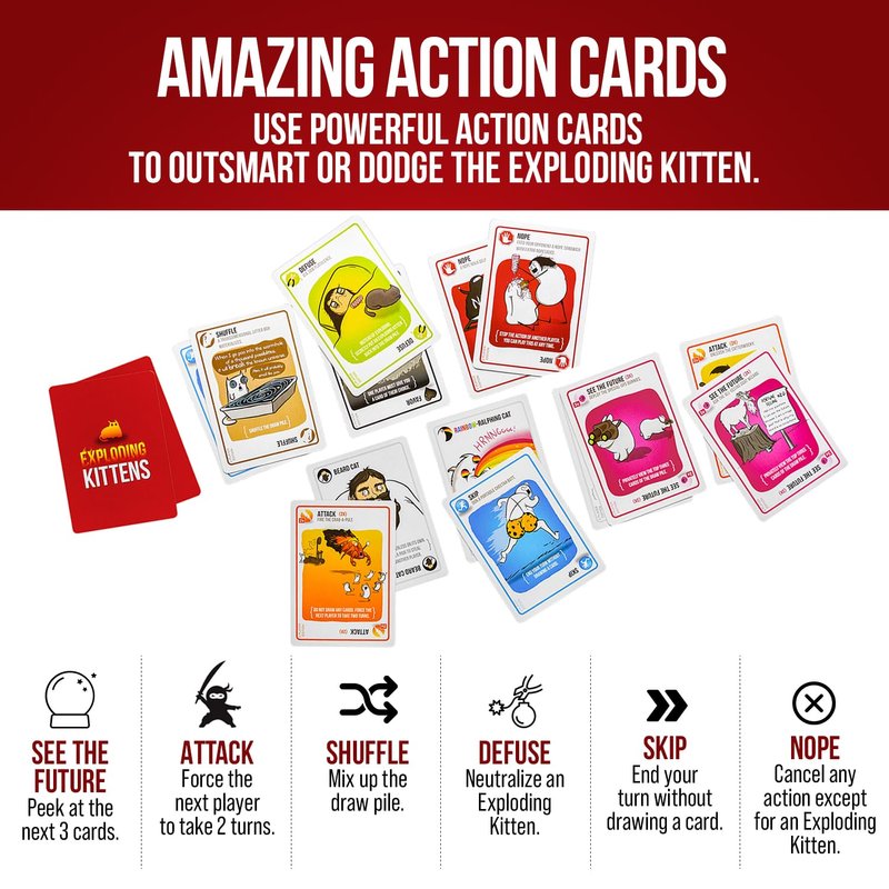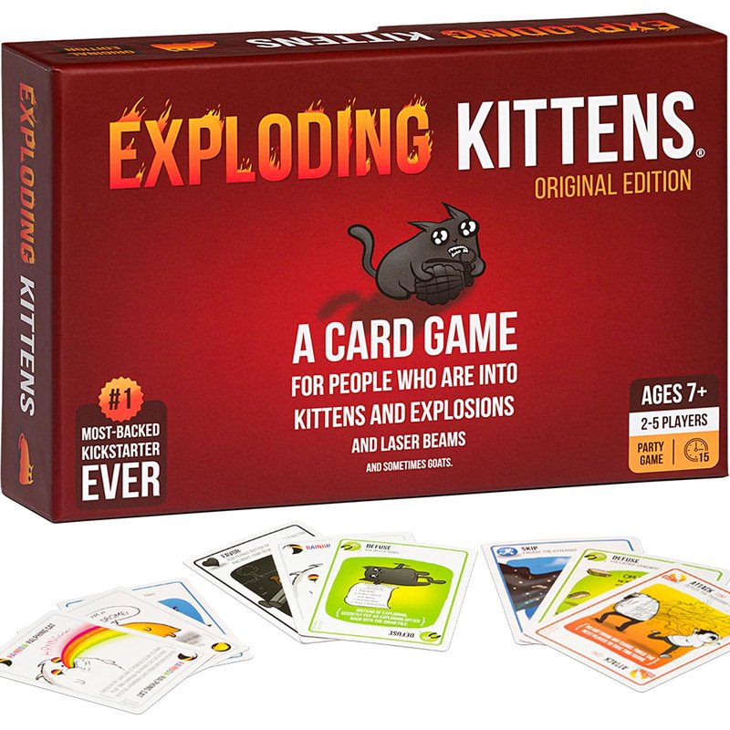 - THE LEGENDARY ORIGINAL MADE FOR TWO TO FIVE PLAYERS: The card game that gave felines a license to kill. The reason cats around the world are being given the side-eye - it’s Exploding Kittens: Original Edition! This kitty-powered card game is all about turning game night into a blast. Try and dodge exploding kittens, betray your friends along the way, and strap on a portable cheetah butt while you’re at it. The last player left alive wins!