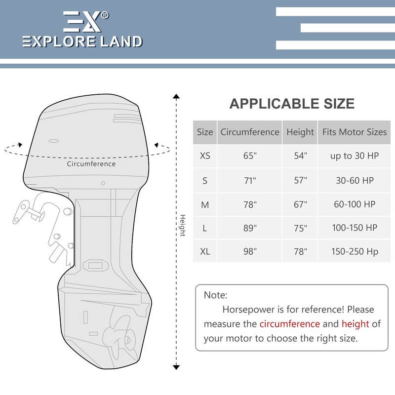 - Upgraded Material – Made of solution-dyed 600D Polyester fabric with waterproof undercoating and UV-proof treatment. Fits for most outboard motors 150-250 HP. NOTE: Don't just refer to the horsepower, please refer to our size chart and measure the circumference and height of your motor carefully before you buy!