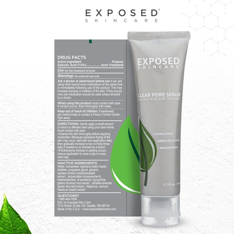 Fed up with blackheads, whiteheads, and unhealthy-looking skin? Not to worry – we’ve created the first-of-its-kind acne treatment salicylic acid serum designed to improve the overall look and feel of your skin!Reverse skin damage with consistent use of this face treatment serum. Formulated with salicylic acid, green tea extract, and licorice root extract, Exposed Skin Care’s Clear Pore Serum is specially made to restore damaged skin from years of harsh acne treatments. Unclog pores, control sebum, and revitalize skin for a once-again-bright, healthy, youthful complexion!Why Choose Exposed Clear Pore Serum:- Eliminates acne breakouts and improves skin tone- Helps removes deep-seated dirt and sebum to prevent blackheads and whiteheads- Paraben-free, sulfate-free, and cruelty-free- Formulated to treat acne for both men and women- Safe to use on all skin types, including sensitive and acne-prone skinStop breakouts in their tracks and destroy acne from the ground up with the Exposed Skin Care Clear Pore Serum!