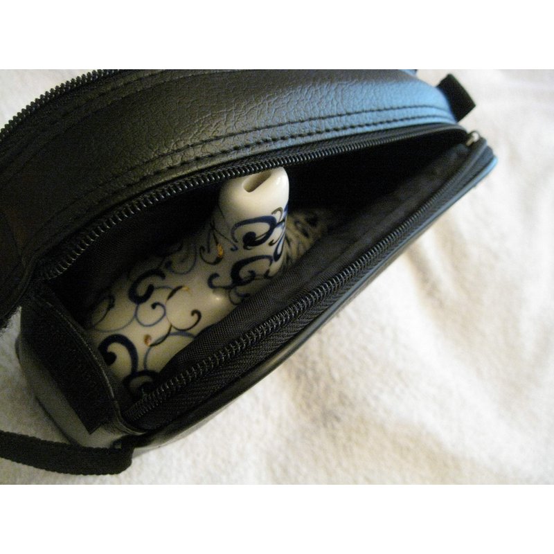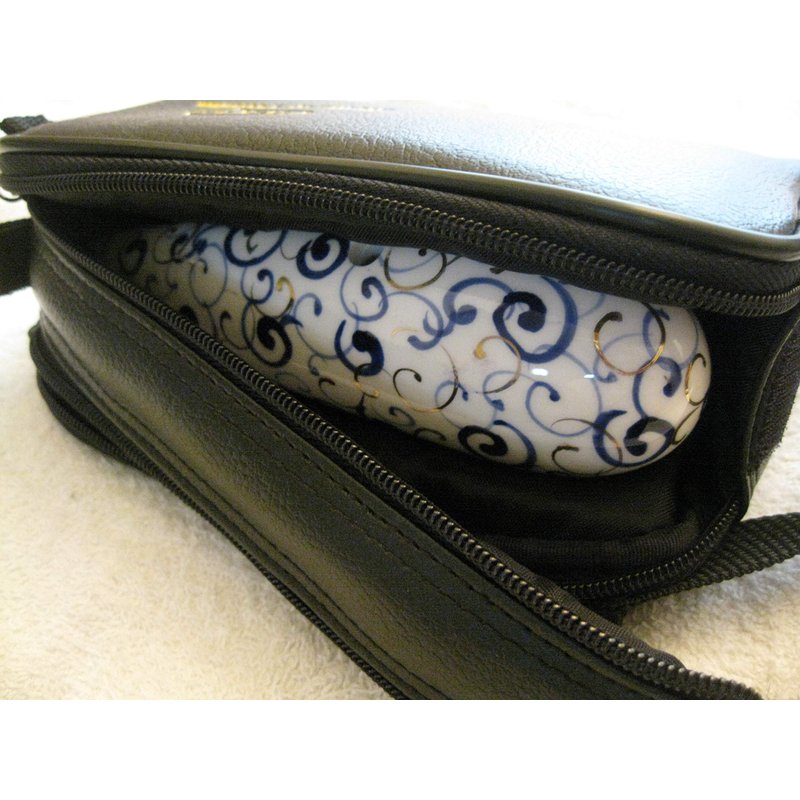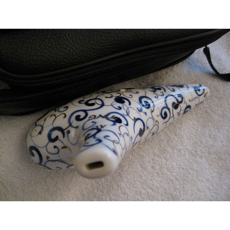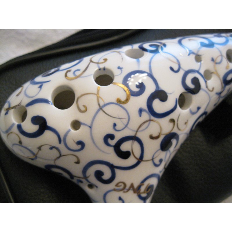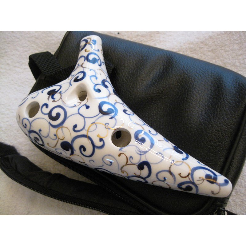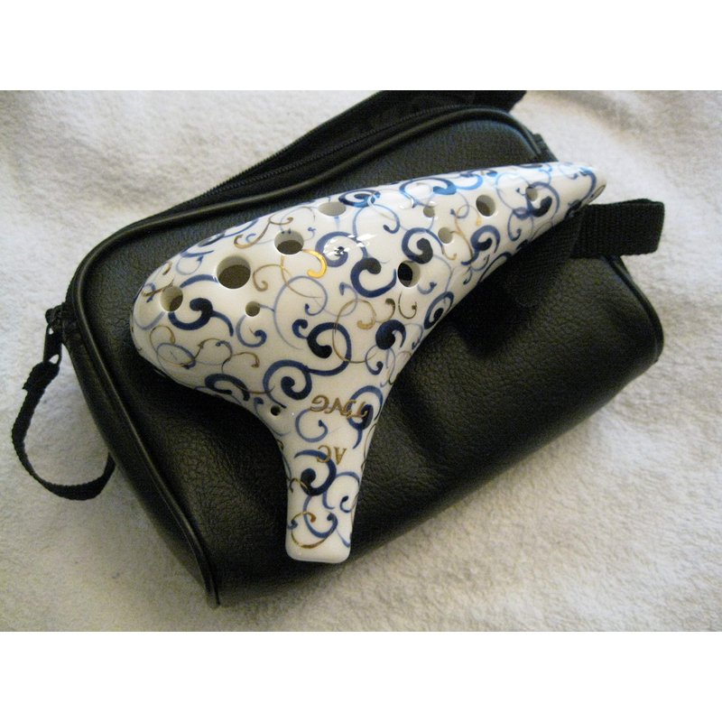 Exquisite Alto C Ceramic Ocarina. Artful with curly ornate plant tendril in blue and gold (genuine gold). High kiln temperature treated - hardness and endurance d. The elegant curly ornate tendril pattern is aesthetic, it looks like a piece of art. Sounding is good - voluminous, mellow, crystal clear and bird chirpy. Also regarded as a very good item for gift. Size: 6 78 inch (Width) 4 12 inch (Height) 2 14 (Thick) inch Weight: 355 g (12.2 Ounce) Comes with a black PU leather bag with inner buffering material to protect the ocarina. Bag has dual zipper that runs smoothly to open and close up. Please view pictures for detail