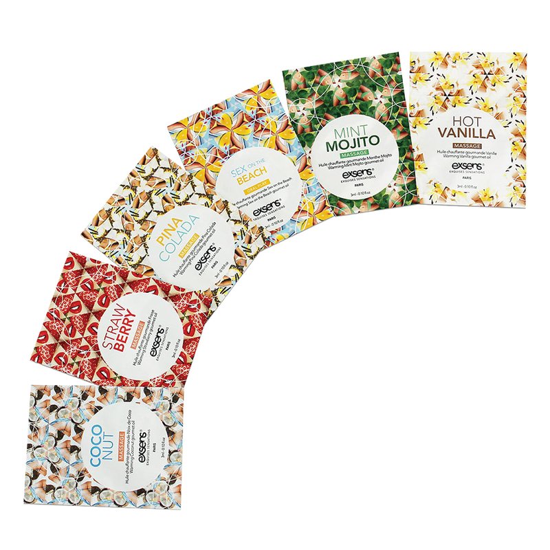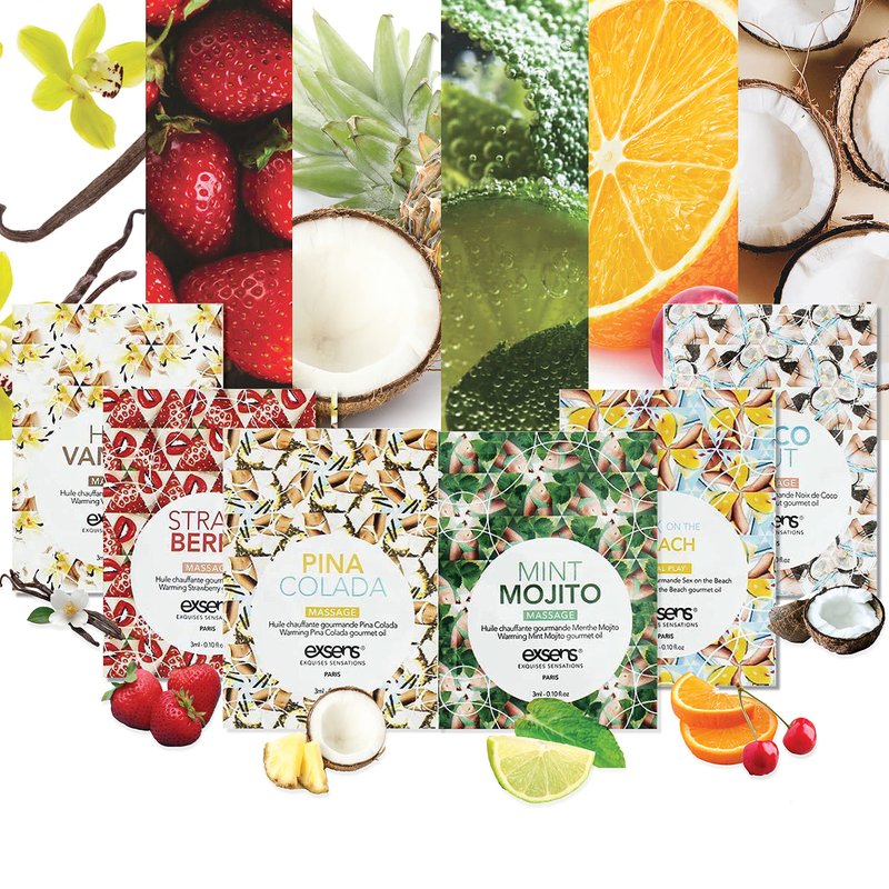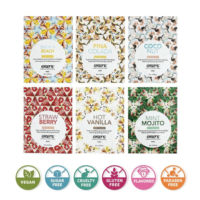 - EXPERIENCE FULL BODY PLEASURE for you or your special someone with Exsens Warming 6 Count Sampler Sensual Massage Oil. Great for romance and safe to use on any body part. Enjoy slight warming sensations in six 3ml one-time-use foils including: Strawberry, Coconut, Hot Vanilla, Mint Mojito, Pina Colada, and Sex on the Beach flavors