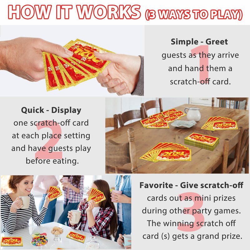 - ●Fun party game: Chinese style design, the New Year fortune cards are totally perfect for celebrating the upcoming party of the Spring Festival. The party game cards are attractive and easy to scratch. You can scratch off the silver coating with a coin. A special warm wishes are printed on the back of the card, wishing you good luck in the new year. Let you spend fun and unforgettable moments with your families and friends.