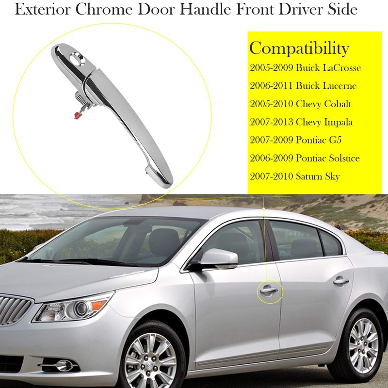 - Compatibility - Exterior left driver side door handle for 2005 2006 2007 2008 2009 Buick LaCrosse, 2006 2007 2008 2009 2010 2011 Buick Lucerne, 2007-2013 Chevy Impala, 2005-2010 Chevy Cobalt, 2007-2009 Pontiac G5,2006-2009 Pontiac Solstice, 2007-2010 Saturn Sky