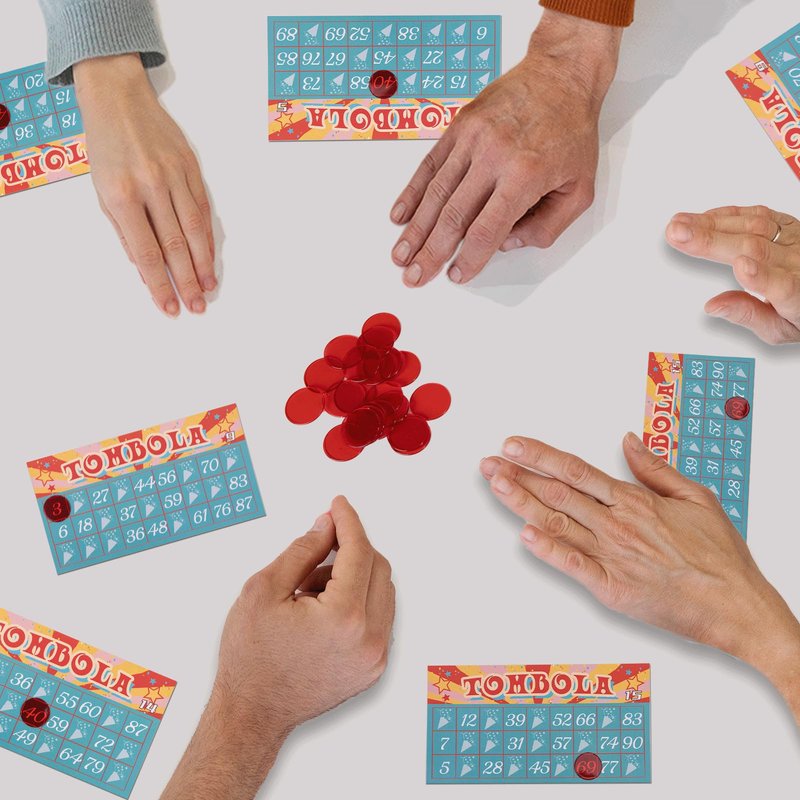 - 【HOW TO PLAY】Pass each player a Tombola card. Pick a tombolone or announcer. The tombolone draws a number chess from the bag, places it on the calling board, and calls out the number! When a number is called, players place a bingo chip on the respective space on their card. Continue until you have a winner!