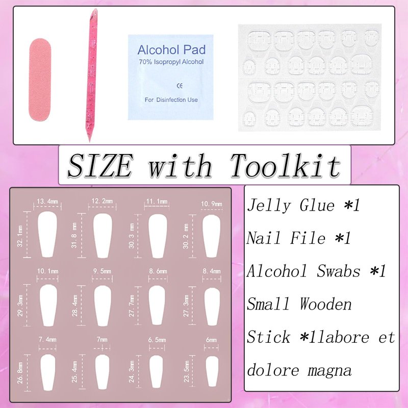 - PACKAGE LIST: Extra long press on nails kit, each box includes 24 fake nails, 1 sheet of 24 adhesive nail tabs, 1 cuticle stick, 1 bottle of nail glue, 1 double sided nail file and gel nail cleaning pads.