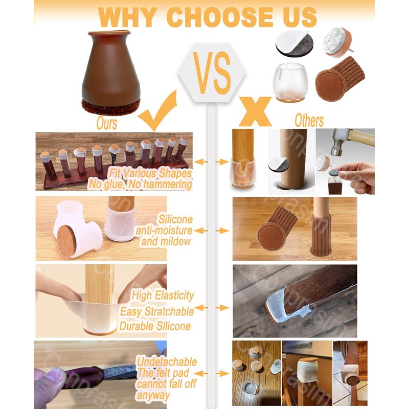- 【Eco Friendly& Durable】24 x Furniture silicon leg covers protect your chair legs and floor from damage, no gel, no nails. 100% made from food grade silicone, combine the felt and the silicone into one inseparable piece, durable, nontoxic, safe for children & pets.Furniture will restore to its original condition after disassembling leg caps, no damage. continue use leg cover at new place, super sturdy, no waste of money.