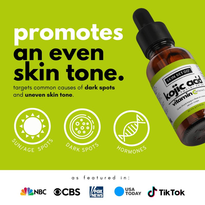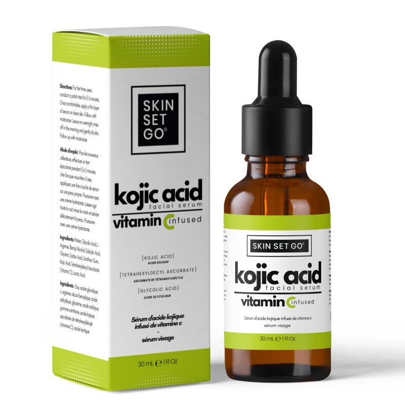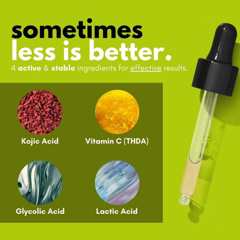 - The Power of Four. Our extra strength 7.5% kojic acid serum only contains four active ingredients. Kojic Acid, Vitamin C, Lactic Acid, and Glycolic Acid. These ingredients dive deep into the skin to inhibit, exfoliate and increase cell turnover. The addition of Vitamin C blends flawlessly with Kojic Acid to provide your skin with a powerful serum that not only brightens dark spots but boosts your skin’s antioxidant levels during the process for a healthier glowing result.