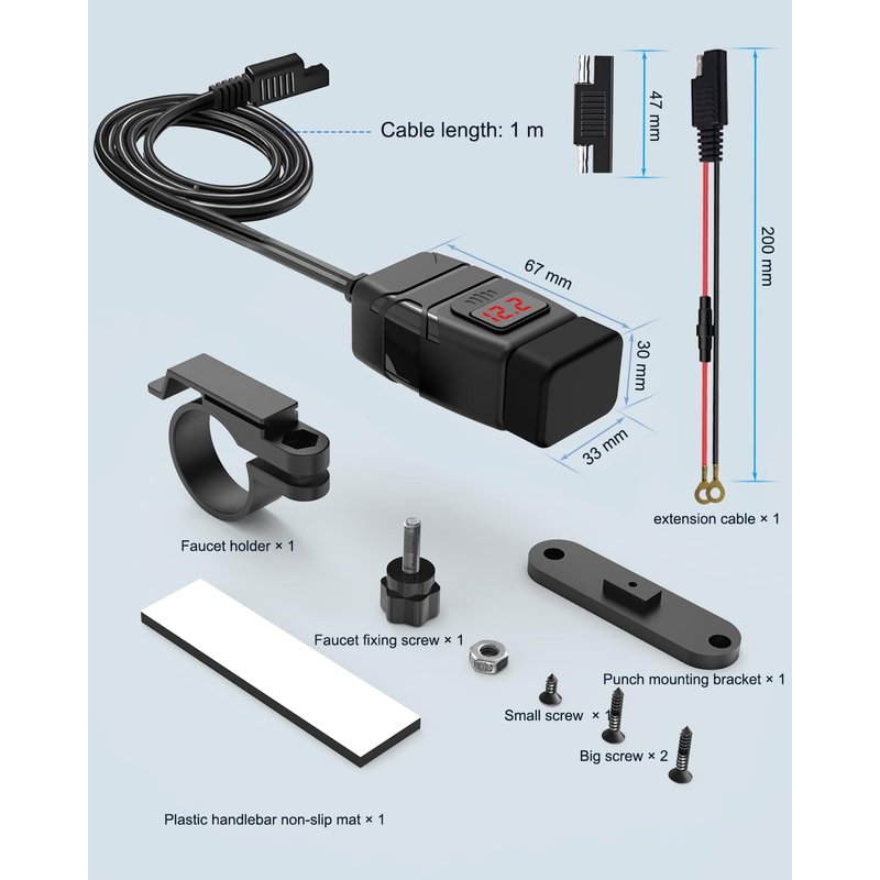 - Motorcycle SAE to USB charger - The product is designed with one SAE interface, which can be used directly with the original SAE interface, Also equipped with a 10A fuse SAE to ring terminal harness, which can be directly connected to the battery, making the installation more convenient.