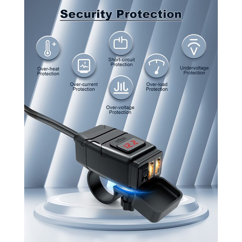 - Safe & Reliable - Built with high-grade ABS materials against scratching. Intelligent IC technology to maximize the charging efficiency, 2 Port USB A motorcycle phone charger with strict control tests ensures safe charging. It offers a great protection system against short-circuiting, over-heating, over-current, and over-charging.