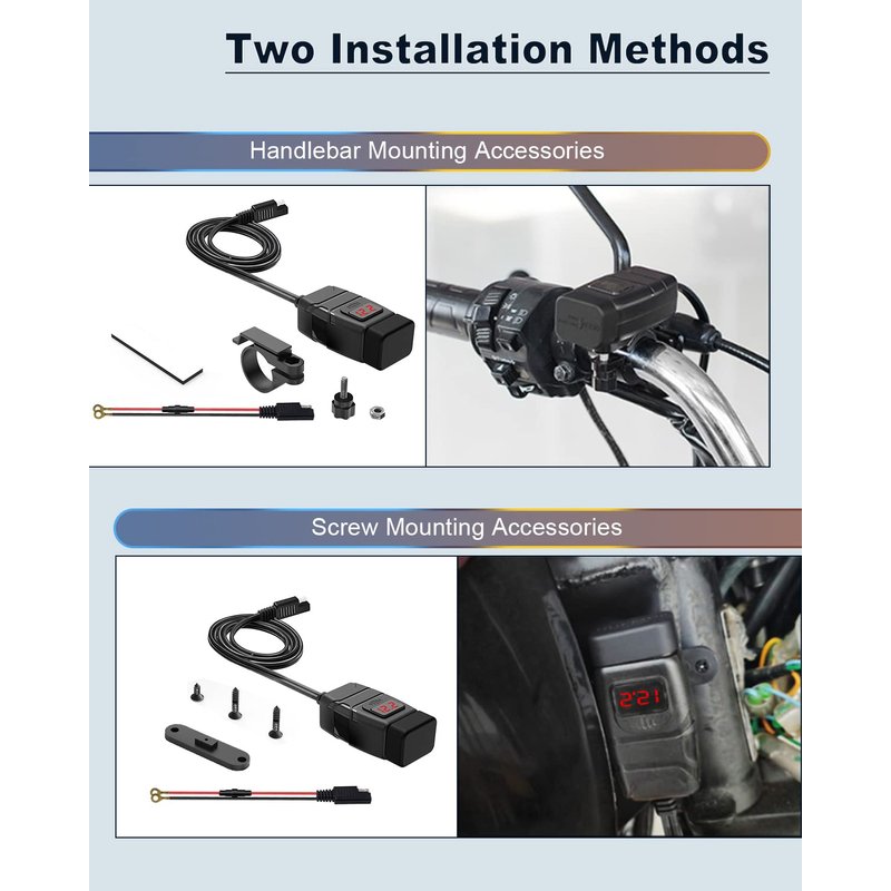 - Wide Compatibility - The motorcycle USB charger Input Voltage is (12V-24V). According to your devices, it can automatically adjust the voltage output (5V/3.4A, 9V/2.5A, 12V/2A), It's fully compatible with all the USB interface electronic products.