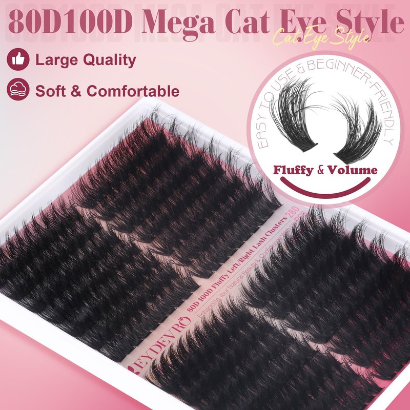EYDEVRO Fluffy Lash Clusters Kit 80D100D Volume Lash Extension Kit 280 Pcs Left/Right Eyelash Extensions kit D Curl Thick Mega Lash Clusters with Waterproof Lash Bond and Seal and Lash Tweezers