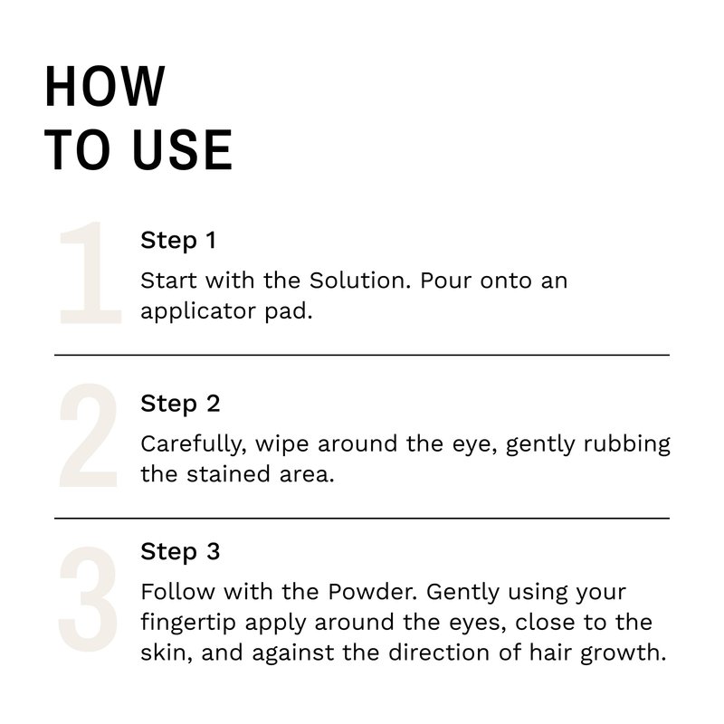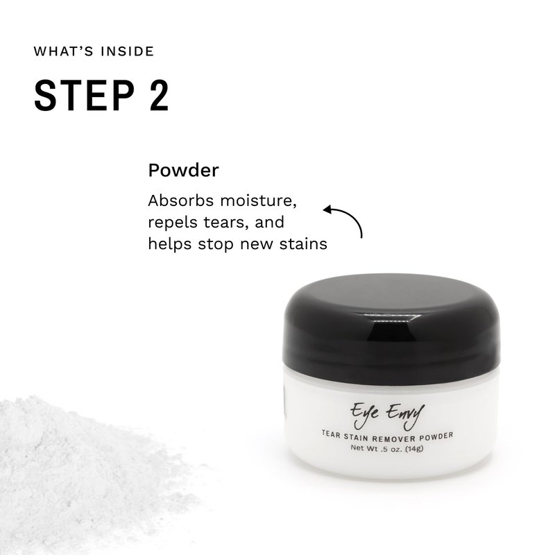 - TWO-STEP SYSTEM: Tear Stain Solution cleans the affected area and helps fight the root cause of the staining; apply with included applicator pads. Tear Stain Powder absorbs excess moisture and helps repel new tears. It is NOT a chalk or cover up, but a natural silk-like powder that safely keeps your pet’s eye dry, stain-free and full of luster.