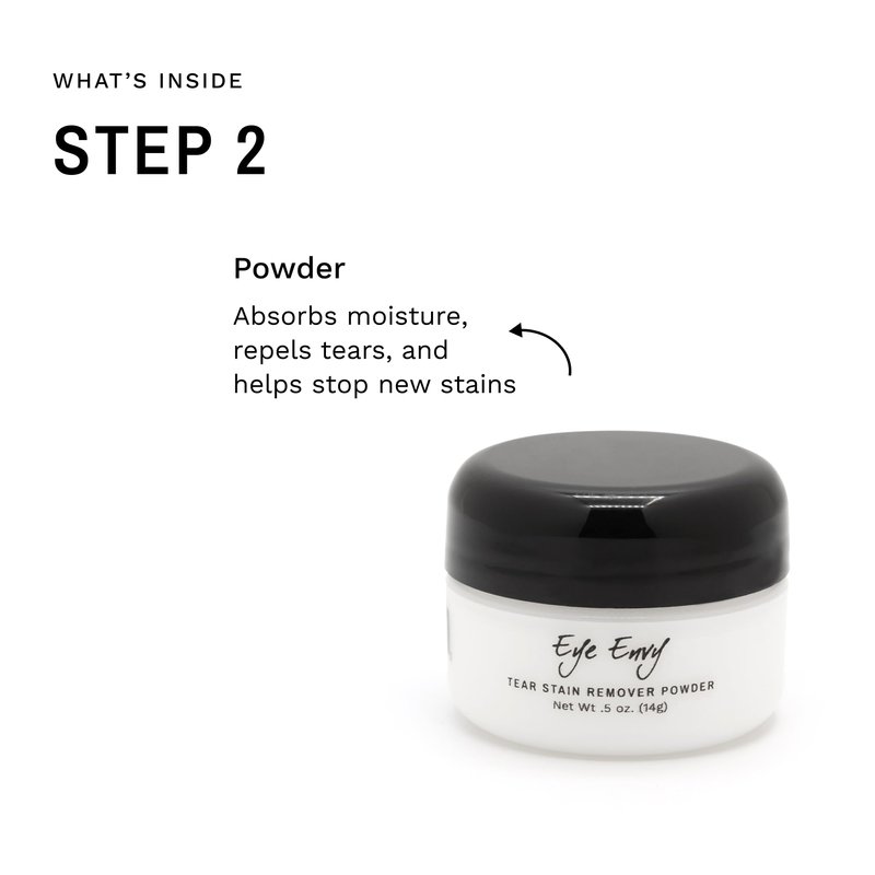 - TWO-STEP SYSTEM: Tear Stain Solution cleans the affected area and helps fight the root cause of the staining; apply with included applicator pads. Tear Stain Powder absorbs excess moisture and helps repel new tears. It is NOT a chalk or cover up, but a natural silk-like powder that safely keeps your pet’s eye dry, stain-free and full of luster.