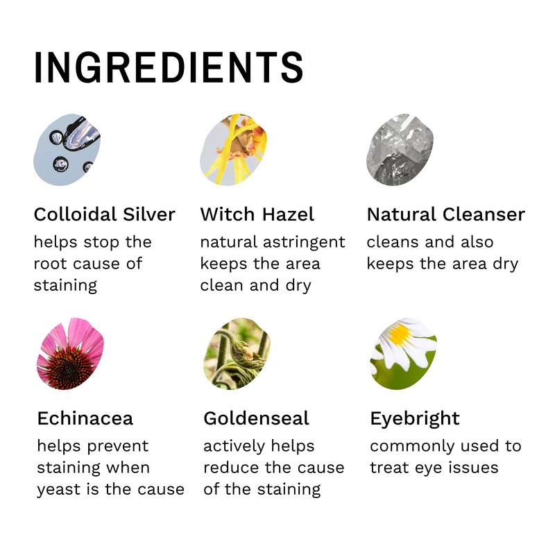 - REMOVE TEARS: Safely remove tear stains with non-irritating and 100% natural ingredients including Colloidal Silver. Remove tear stains in 7 days with daily use. For tear free eyes, use weekly once original tear stains are removed. Apply directly around the eyes and between skin folds.