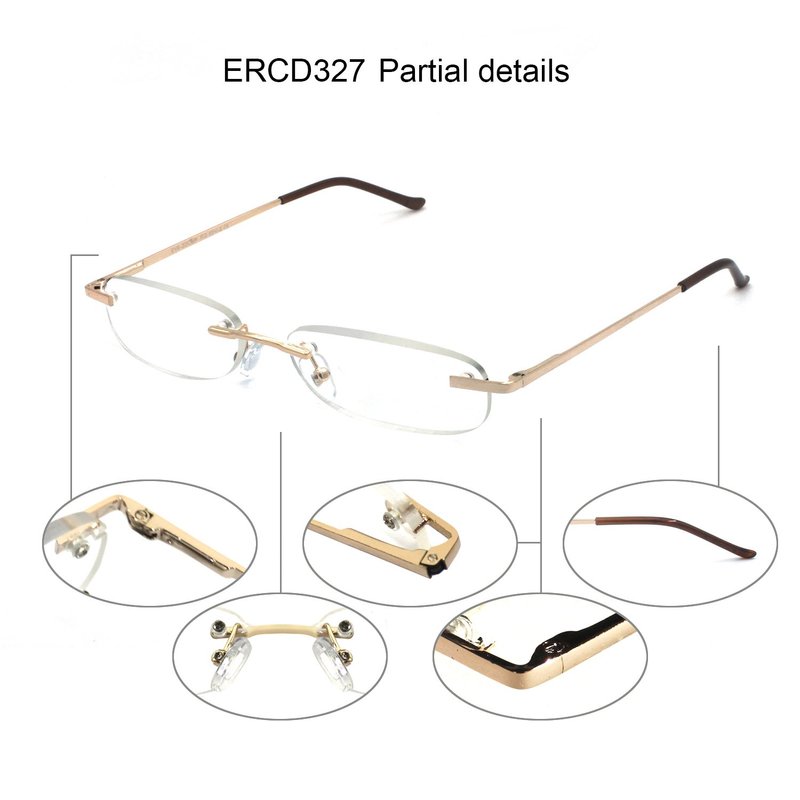 - EYE ZOOM Slim metal rimless reading glasses with super lightweight aluminum case, easy to carry and use. Classic-shaped look good on any face. Spring-hinged temples, help glasses fit your face.
