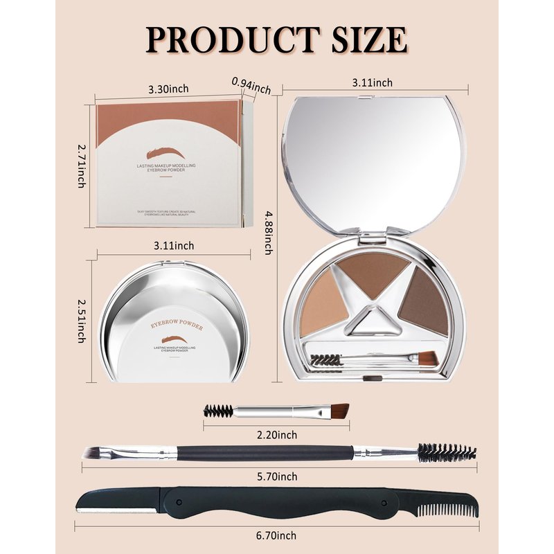 - Tinted Eyebrow Powder Set - You will get a 3-color eyebrow powder palette with mini brush, 1 Pcs double head brow brush and 1Pcs double brow razor. It can easily shape and outline the eyebrows and make your eyebrows more beautiful.