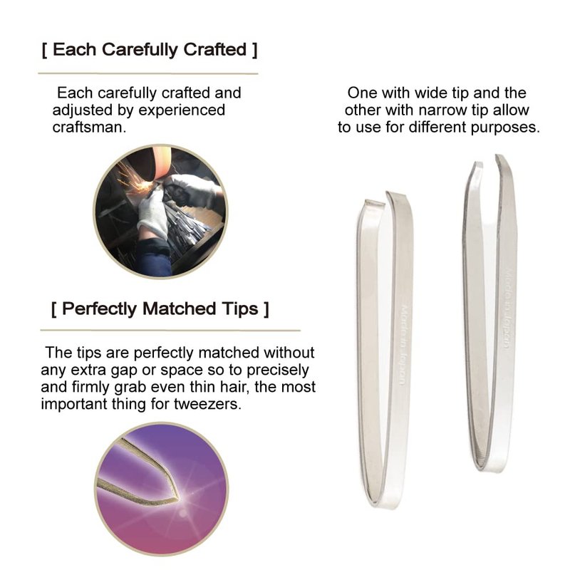 - [ Perfectly Matched Tips ] Each carefully adjusted by craftsman, the tips are perfectly matched without any extra gap or space so to precisely and firmly grab even thin hair, the most important thing for tweezers.