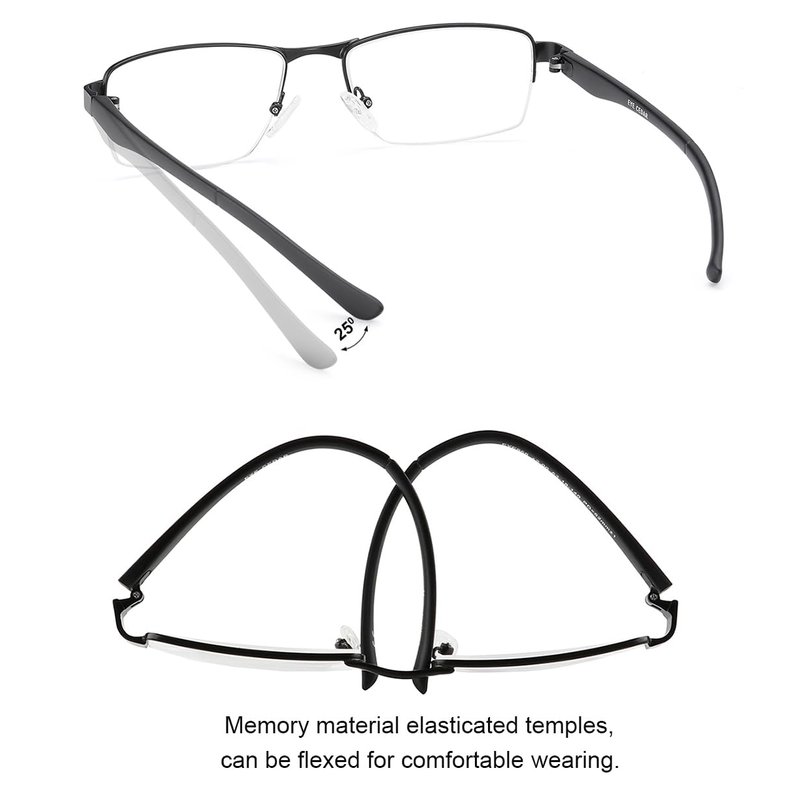 - Metal Frame: Elegant and simple metal half-frame style, stainless steel is strong and durable, universal size suitable for most face shapes wearing effect good svelte and textured. Super elastic PC material glasses temple are lightweight and durable, can be bent at will and not easily broken, soft to the skin and comfortable to wear. Spring hinges and adjustable nose pads help the glasses adapt to the shape of your face
