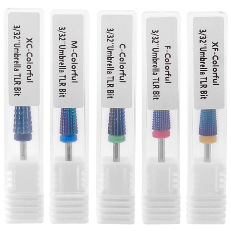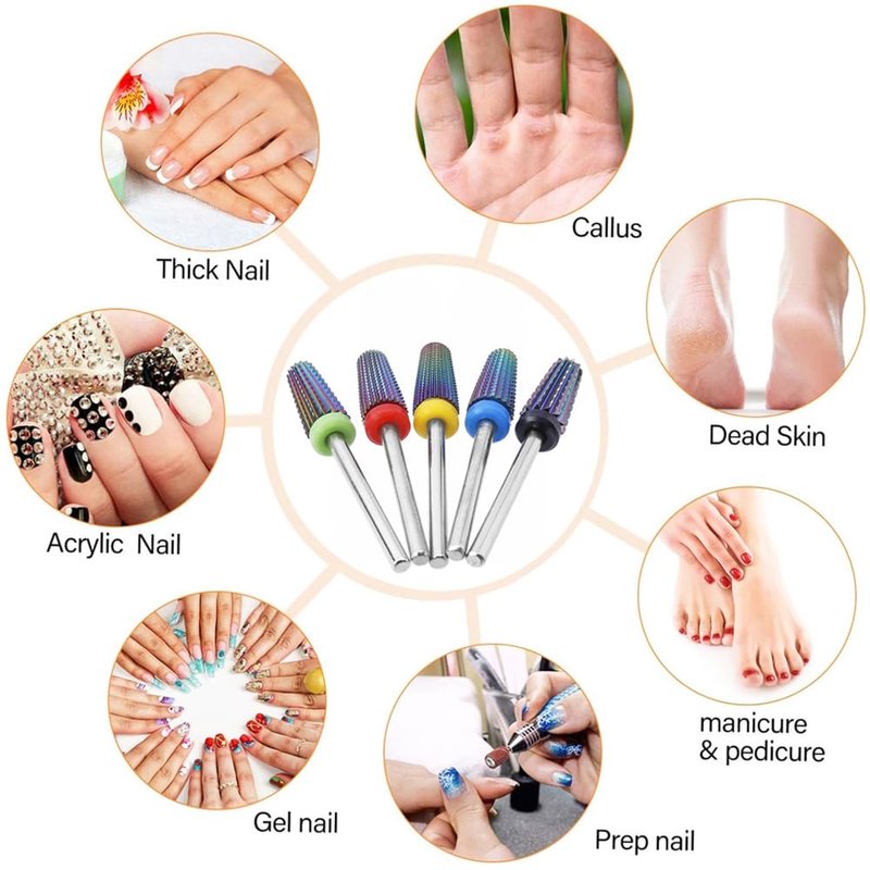 - 5 Sizes Nail Drill Bits: 5 nail tungsten steel grinding heads in XF (extra fine), F (fine), M (medium), C (coarse), and XC (extra coarse). Each head is color-coded for easy identification and different nail texturing purposes.