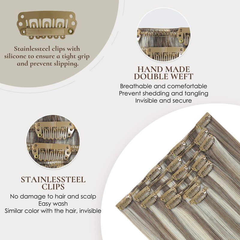 - 【Comfortable & Secure & Quick to Wear】Stainlessteel clips with unique U-shaped design are firm and comfortable to wear. The back has a soft silicone to ensure a tight grip and prevent slipping, no damage to hair and scalp. Clip ins human hair extensions can be worn and took off freely within 5 minutes by yourself to change hairstyle for different occasions.(Wedding, Concerts, Make-up Parties, Dating, Prom and on). Even if it's your first time wearing a hair extension, you can easily handle it.
