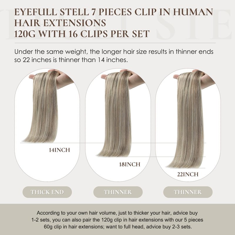 - 【Clip on Human Hair Extensions Specifications】7 pieces of 120g clip ins hair extensions 120g with 16 clips per set, 105g net weight without clips. Under the same weight, the longer hair size results in thinner ends, so 22 inches is thinner than 14 inches. Just to thicker your hair, advice buy 1-2 sets, you can also pair the 120g clip in hair extensions with our 5 pieces 60g clip in hair extensions; want to full head, advice buy 2-3 sets. We offer 2 replacement clips and an alligator clip.