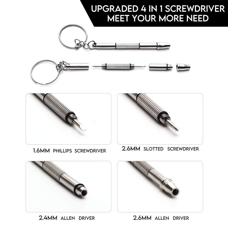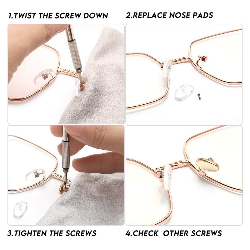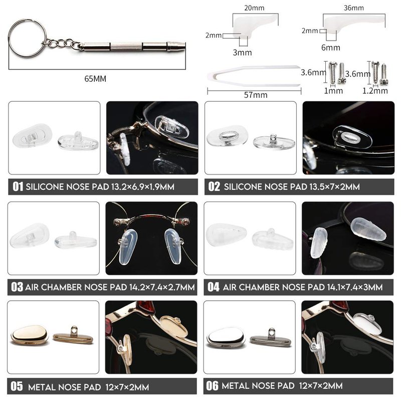 - WHAT ARE IN PACKET: nose pads(6 styles)* 10 pairs, 4 in 1 screwdriver* 1 pcs, tiny screws* 5 pairs, silicone ear hooks* 2 pairs, glasses clean cloth* 1 pcs, and tweezer* 1 pcs, all of these were put in a plastic organize box.