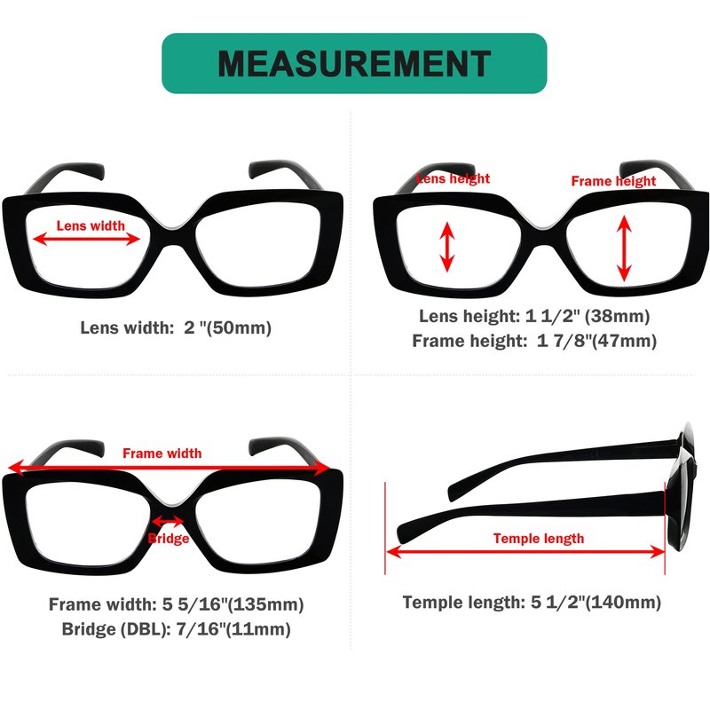 - Products Dimension - Frame Material is Plastic,Lens width about 2 inches(50mm),Frame width about 5 5/16 inches(135mm),Lens height about 1 1/2 inches(38mm),Frame height about 1 7/8 inches(47mm), Bridge(DBL) about 7/16 inches(11mm), Temple length about 5 1/2 inches(140mm),with spring hinge