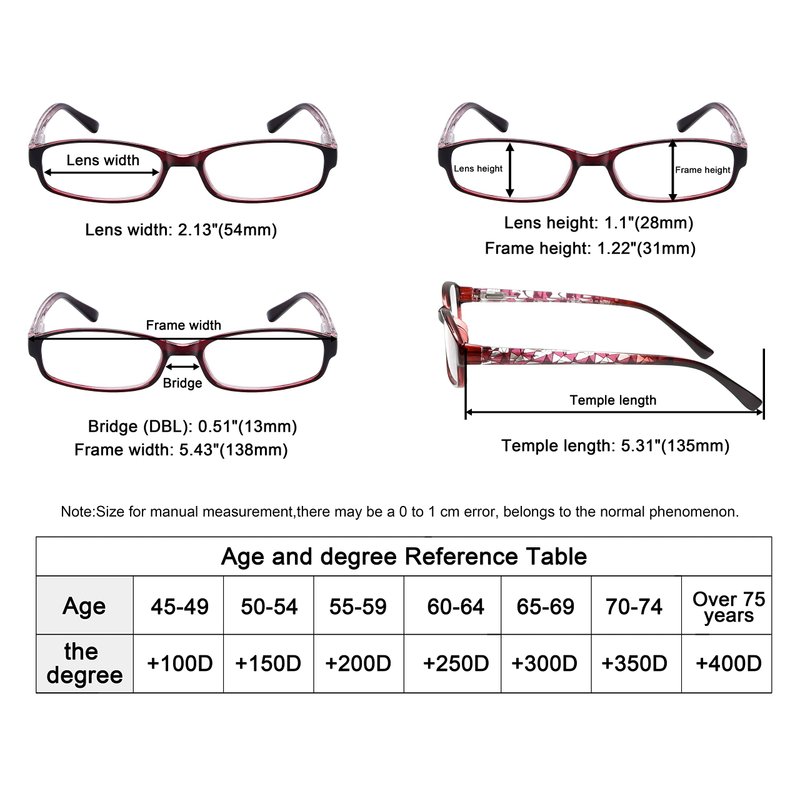 - PRODUCTS DIMENSION-Frame Material: Plastic, Lens width: 2 1/8"(54mm), Frame width: 5 7/16"(138mm), Lens height: 1 1/8"(28mm), Frame height: 1 1/4 "(31mm), Bridge (DBL): 1/2"(13mm), Temple length: 5 5/16"(135mm), Spring hinge: Yes, Lenses: Aspheric, Head size: Medium To Wider.-able frame