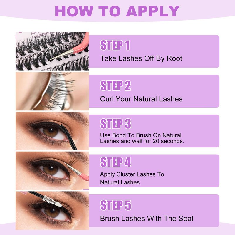 - How to use the lash extension kit: The DIY lash extension kit is very easy to use at home. Curl your lashes with an eyelash curler. Apply cluster lash extension glue to the roots of your cluster lashes or lightly brush your natural lashes with a lash bond. After applying to the roots of the lashes, lightly brush on a seal to strengthen the individual lashes. Finish. Easy to do even if you're a beginner.