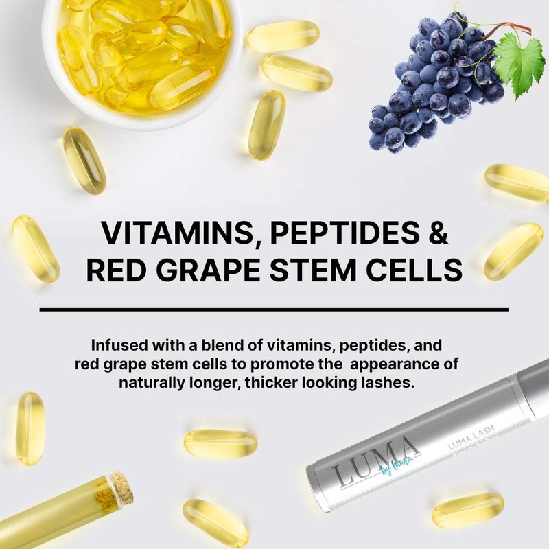 To enhance growth, our lash growth serum contains the following ingredients: grape stem cells which help make lashes thicker and fuller; peptides which moisturize and condition lash strands; glycerin which helps prevent moisture from escaping; and panthenol which provides nutrition for long-term hydration.